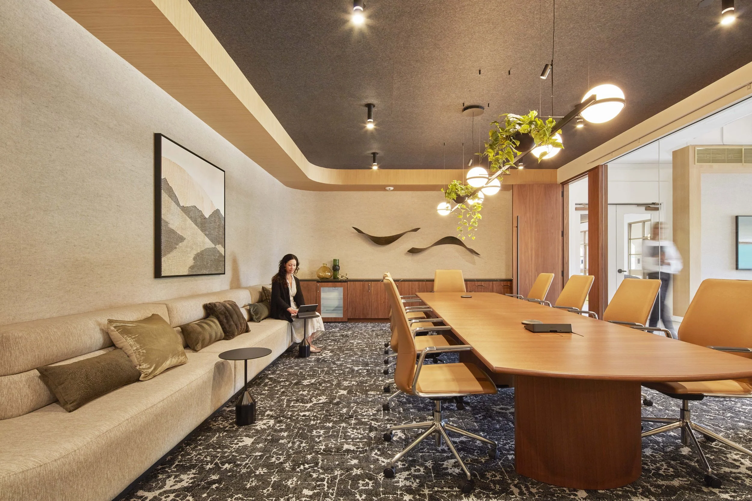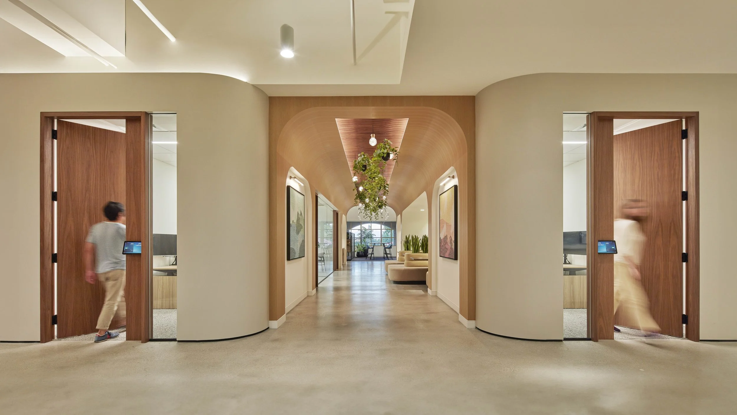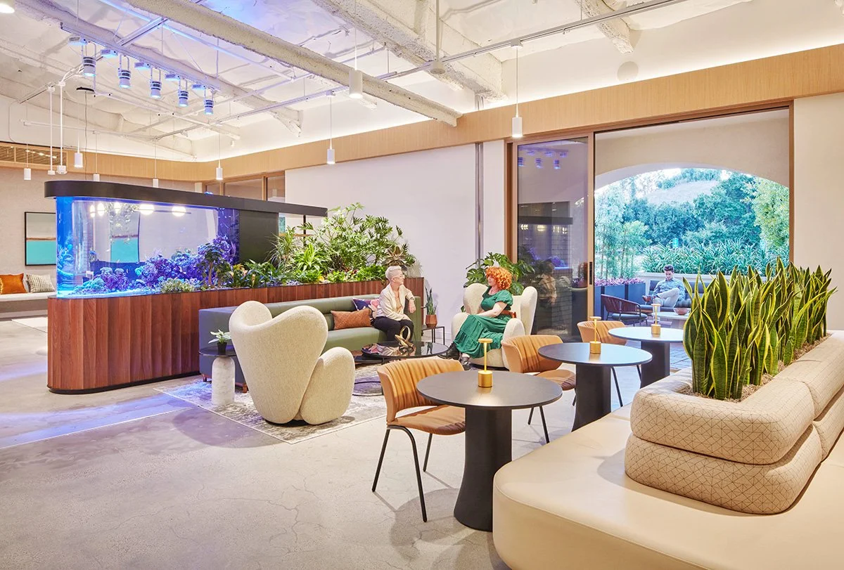 The design is centered on natural, earthy tones that evoke a clean, sophisticated, and inviting aesthetic for employees and visitors alike. Soft curves act as a guiding rhythm, weaving through the office and leading to pivotal communal areas. At the reception, a grand, curved saltwater aquarium extends a warm, colorful, and lively welcome. The artful layering of plants, from ground to ceiling, creates a lush landscape guiding individuals through a sequence of arches into the central collaboration corridor where suspended greenery and lighting accentuate conversation nooks and huddle rooms, fostering an atmosphere of community and activity.