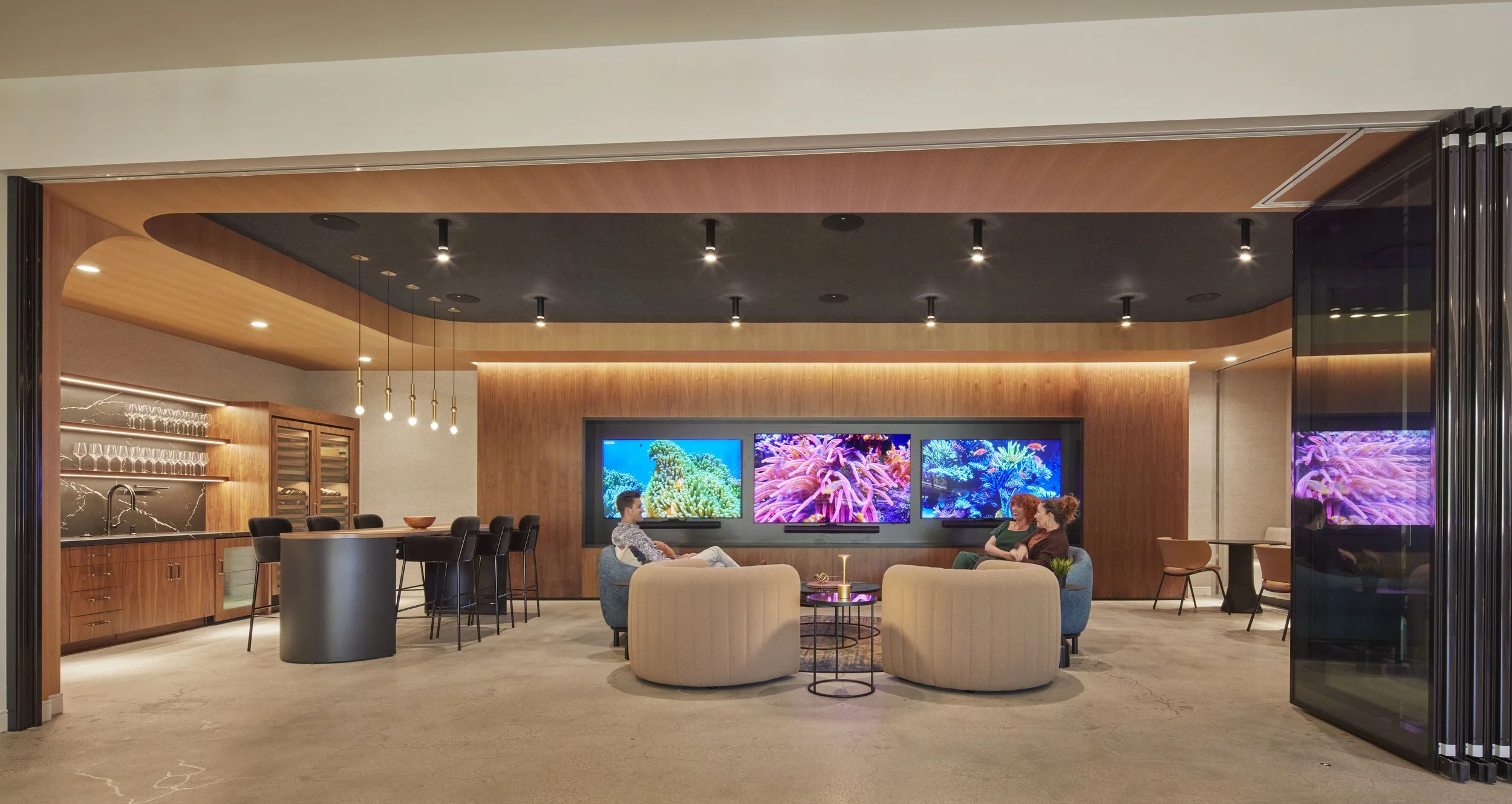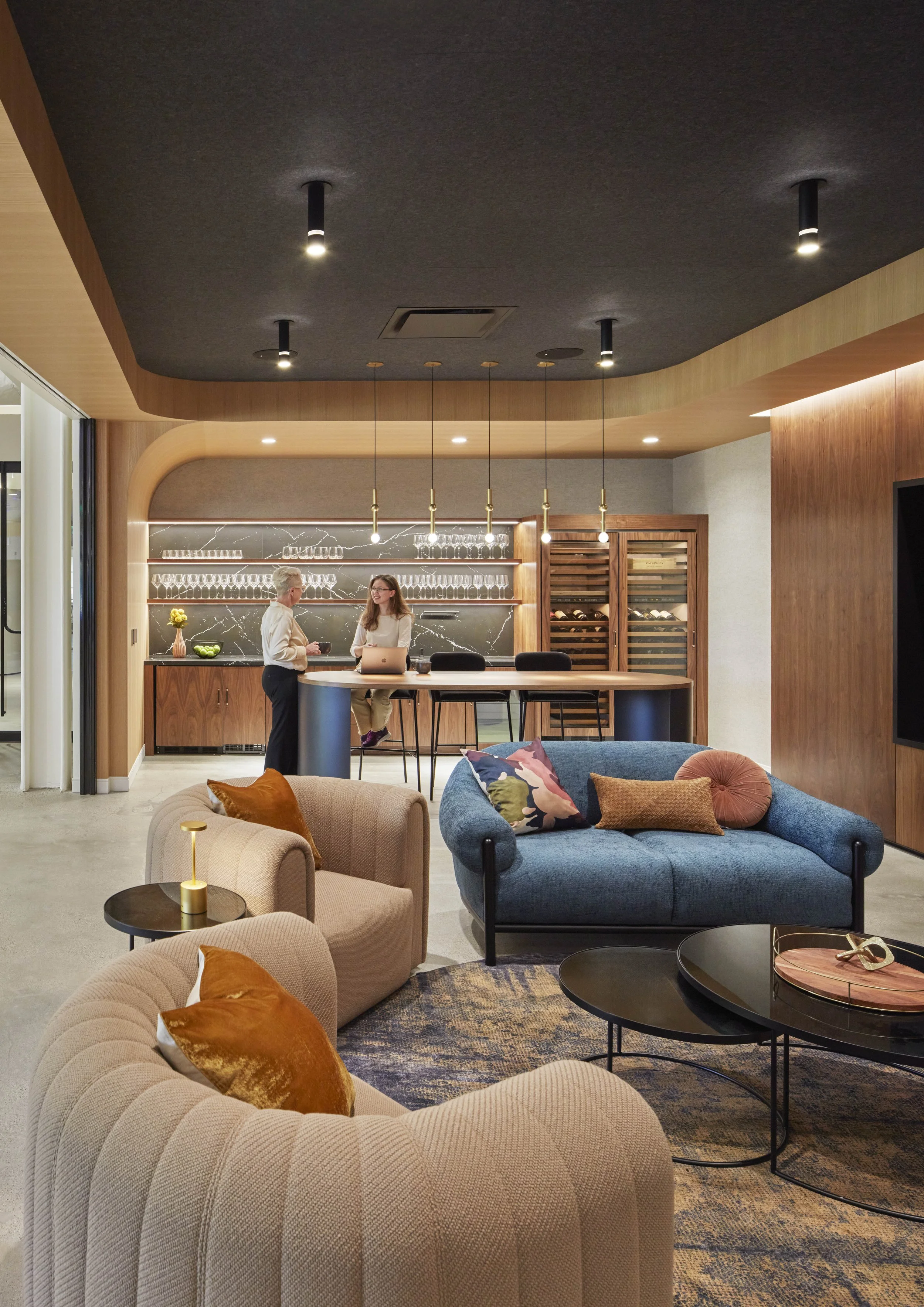Amenities abound, including a central cafe opening onto a private outdoor patio, numerous coffee stations, and a versatile wine tasting lounge that transforms into an event space. The integration of soft curved glass partitions for private offices and meeting spaces harmonizes seamlessly with custom-built casegoods, lounge seating, and warm-toned wooden surfaces. The result is a headquarters that not only meets the functional needs of a modern business but also elevates the work environment to a level of comfort and aesthetic appeal that reflects Poms & Associates’ commitment to excellence.